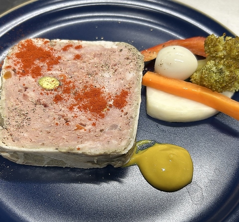 豚肉の旨みと鶏白レバーのコクをギュッと閉じ込めた、濃厚な味わいのクラシックテリーヌ。ハーブやスパイスで香りを整え、赤ワインとの相性も抜群。お好みでマスタードを添えてどうぞ。