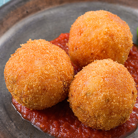 トマトソースで炊き込んだリゾットにミートソースを包み、カリッと香ばしく揚げました。ナイフを入れると、中からあふれる旨み。アツアツを頬張れば、イタリア気分!