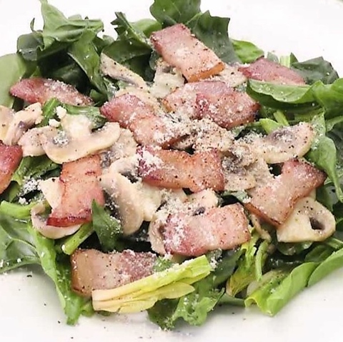 温かいベーコンの脂をまとわせた、ほうれん草とホワイトマッシュルームのシンプルサラダ。じゅわっと香ばしい旨みが葉野菜に絡んで、お酒との相性も抜群です。