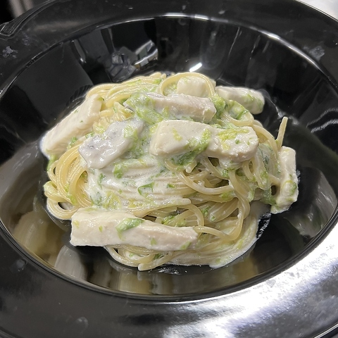 新鮮なメカジキと香り高い岩海苔を使用した、和と洋が融合したクリーミーなパスタ。生クリームのまろやかさに、めんつゆの深い旨味を加えて、和風のテイストを引き立てました。メカジキの淡白な味わいと、岩海苔の風味がクリームソースと絶妙に絡み、ひと口ごとに豊かな味わいが広がります。