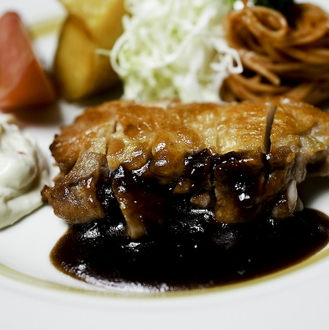 主力メニュー、ハンバーグには贅沢に国産牛を100%使用!牛肉の質からこだわり、肉汁溢れるジューシーな美味しさを追及しました。コク深い特製デミグラスソースと合わせた味わいはまさに絶品★丁寧に作り上げられた自慢の一品です。