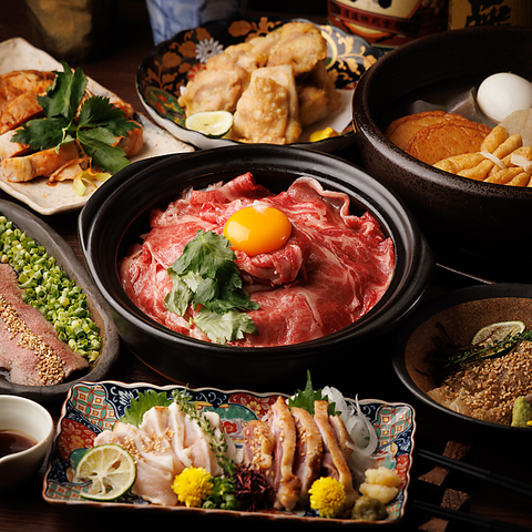 くろしき名物の土鍋飯をメインに、若鶏の西京焼き、博多名物の胡麻カンパチ、さつま知覧どりのタタキ、薩摩おでん、大分名物とり天など、こだわりの逸品や九州の名物を一度に堪能できる全9品。お飲み物はアサヒスーパードライを含む2.5時間飲み放題付。九州和食と土鍋飯を味わうコースです。〈※金曜/祝前日は2時間制となりますので予めご了承ください。〉