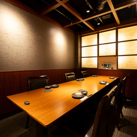 木のぬくもりと柔らかな照明が落ち着いた雰囲気を作る、プライベート個室。