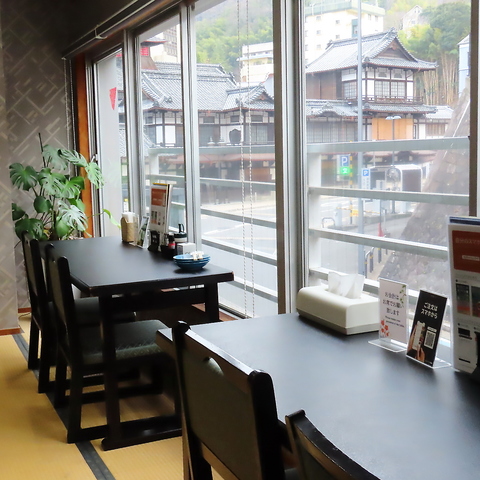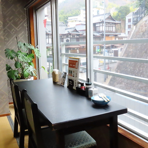 畳の上にテーブルと椅子を配した和モダンな空間は、開放感抜群です。大きな窓から景色を眺めながら、ホテルの板前さんが腕を振るう本格和食をゆったりと楽しめます♪道後温泉駅から徒歩5分という好立地ながら、静かで落ち着いた時間が流れる店内で、心安らぐお食事のひとときをお過ごしください◎