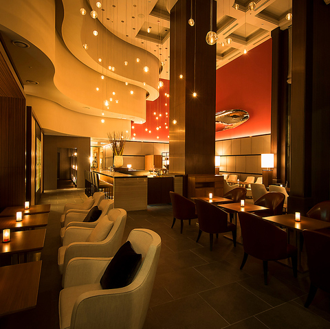 夜は高さのある天井から柔らかな光が降り注ぐ、ラグジュアリーで落ち着いた雰囲気の空間となっております。お食事はもちろん、お待ち合わせやご商談などにも是非ご利用ください。