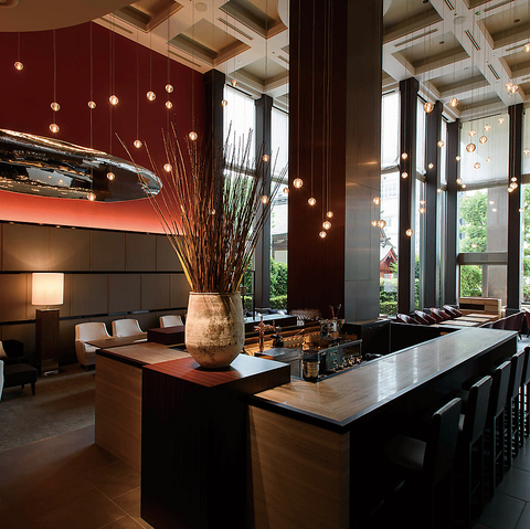 夜は高さのある天井から柔らかな光が降り注ぐ、ラグジュアリーで落ち着いた雰囲気の空間となっております。お食事はもちろん、お待ち合わせやご商談などにも是非ご利用ください。