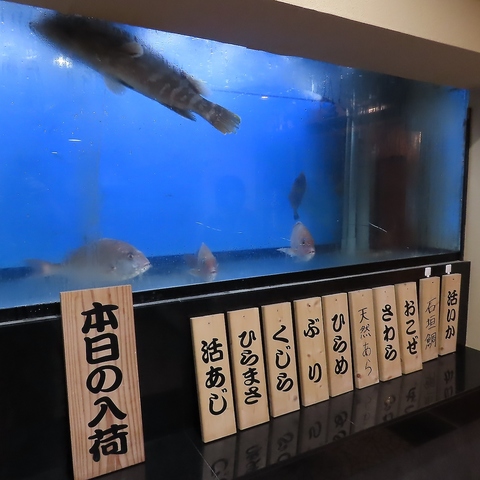 いつでも天然活魚がお愉しみいただけるように店内には、約2トンの巨大生簀を完備しております。魚は漁師と直接取引をして素材の鮮度と安全にこだわります。漁師直送の天然活魚、そして市場直送の鮮魚の数々を目利き、厳選し丁寧に調理いたします。