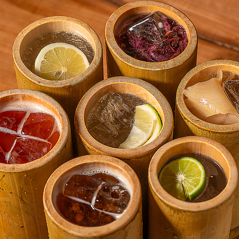 「国産生レモンサワー」をはじめ、全てのサワーを竹筒でご提供しています。竹のひんやりとした感触と香りがサワーに移り、五感で楽しむことができます。見た目にも美しい、和の趣あふれる演出をお楽しみください。お酒の肴にぴったりな「あて巻き」や「肴鮨にぎり」と合わせて、目でも舌でも贅沢な時間をお過ごしいただけます。