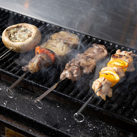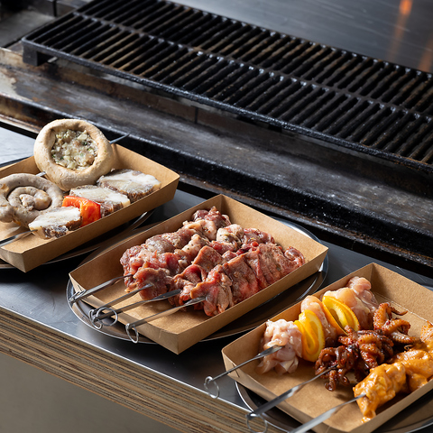 羅臼産の炭火の焼き台でBBQスタイルで楽しめる串焼きが自慢!ワイルドポテトサラダの厚切りベーコンも【SKOOKUM】から仕入れています。串焼き以外にも日替わりのデリやがっつり食事メニューなどもあるので1軒目からの利用も◎