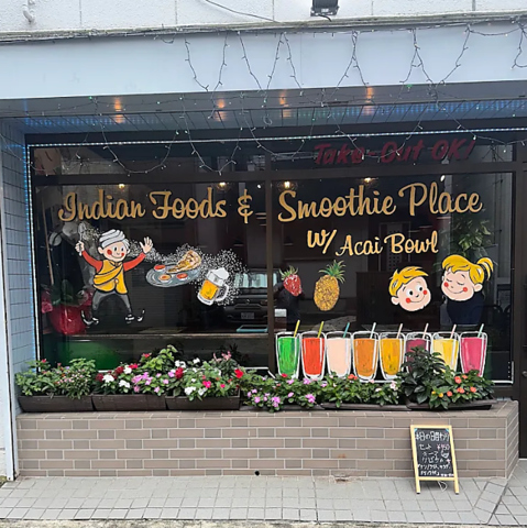 Buzz Bowl Curry Zone の大きな窓には、カラフルな絵が描かれています!外から見ても楽しく、店内では明るいスタッフ一同がお待ちしております!スパイスの香りとともに、心をわくわくさせる空間♪