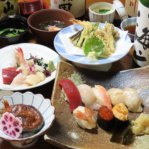 新鮮なネタで握る上生寿司をはじめ、刺身や天ぷら、焼き物など旬の味覚を堪能できる会席コースです。茶碗蒸しやおまかせの一品も付いており、季節ごとの彩り豊かな品々をお楽しみいただけます。大切な方との会食や記念日にもぴったりです。