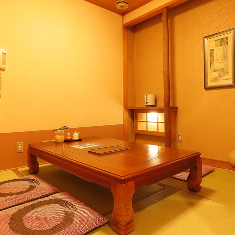 【プライベートな時間を過ごせる個室】周りを気にすることなく、ゆっくりと会話や食事を楽しめる個室を完備しています。6名様まで入れる個室が5部屋あり、接待やご家族での会食、少人数の宴会にも最適です。畳の感触が心地よい小上がりのお座敷で、くつろぎながらお過ごしいただけます。