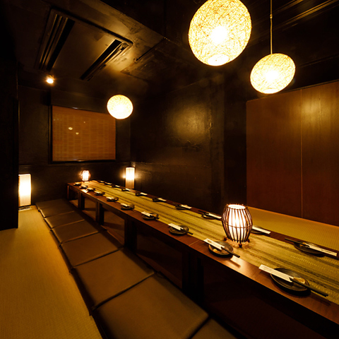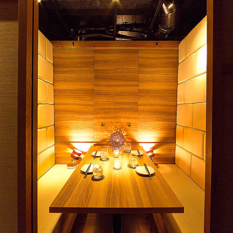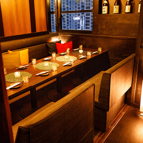和情緒漂う落ち着いた雰囲気の個室空間でゆったりとしたひと時をお過ごしください。間接照明と細部にまでこだわった内装がより一層大人な雰囲気を演出してくれます。周囲を気にすることのない完全個室でのご宴会をお楽しみいただけます。2名様の少人数からご利用いただけますので接待や会食、デート、記念日にも最適です。