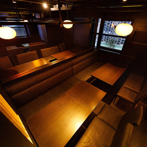 和情緒漂う落ち着いた雰囲気の個室空間でゆったりとしたひと時をお過ごしください。間接照明と細部にまでこだわった内装がより一層大人な雰囲気を演出してくれます。周囲を気にすることのない完全個室でのご宴会をお楽しみいただけます。2名様の少人数からご利用いただけますので接待や会食、デート、記念日にも最適です。
