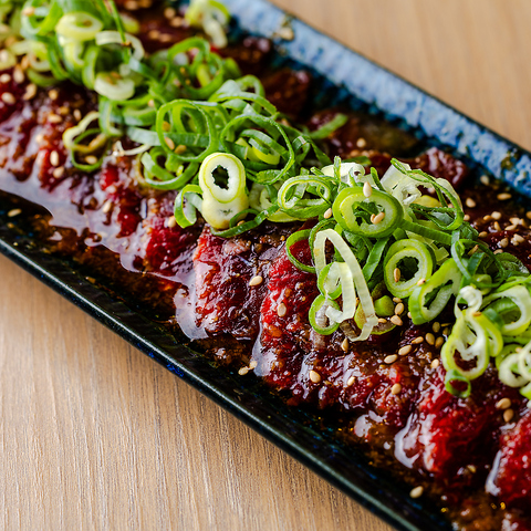 鮮やかな赤身が美しく並ぶ、まるでレッドカーペットのような一皿。新鮮な馬肉ならではのしっとりとした食感と上品な旨みが口いっぱいに広がります。見た目も華やかで、会話を盛り上げる贅沢な逸品です。