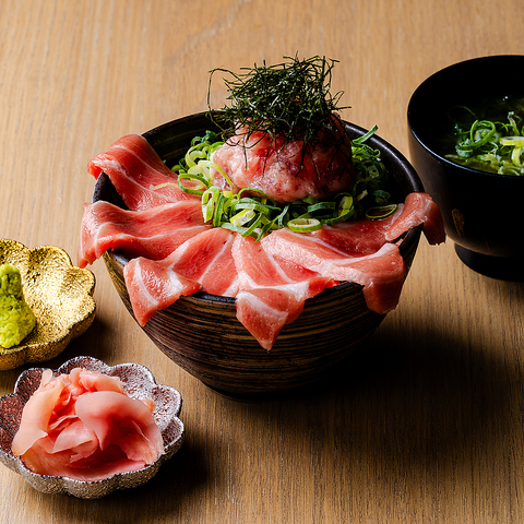 脂のり抜群の本鮪大トロと、なめらかな口当たりのネギトロを豪快に盛り付けた贅沢丼。濃厚な旨みととろける食感がご飯と相性抜群で、一口ごとに幸せな味わいが広がります。鮪好きにはたまらない至福の逸品です。
