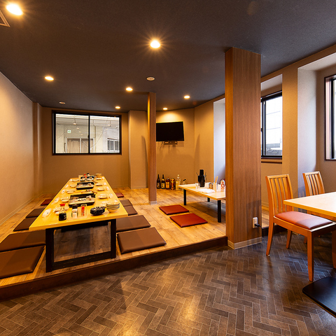 明るく開放的な店内は、焼鳥を囲むひとときに最適◎当店は焼鳥だけでなく、刺身や揚げ物などのメニューも充実しております。 お席はテーブル・カウンター・お座敷の3タイプをご用意☆ 少人数から大人数まで、どんなシーンにも対応可能となっております。 2階のお座敷は最大16名までご利用可能、プライベート感を大切にしたい集まりに最適です☆