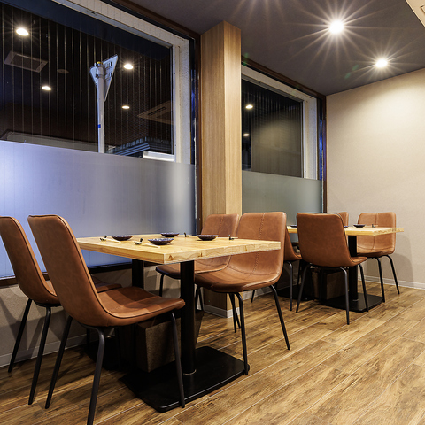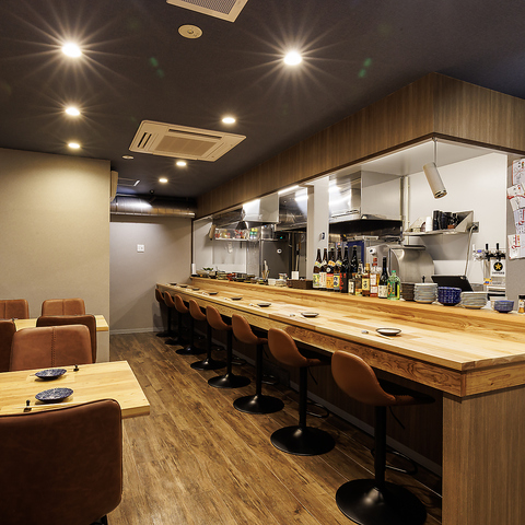 臨場感溢れる人気のカウンター席、温かみある木目調のテーブル席を完備。洗練された空間で居心地の良さが◎