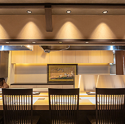 落ち着いた和の空間の中、特別な会席料理を堪能できるカウンター席。職人の巧みな手仕事を目の前で見ながら、贅沢なひとときをお過ごしください。