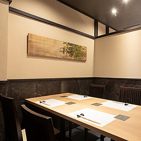 完全個室席は、プライバシーが確保された静かな空間です。2名から8名まで利用可能で、大切な会食や接待に最適。和のデザインが施された落ち着いた雰囲気の中で、特別な料理を心ゆくまでお楽しみいただけます。