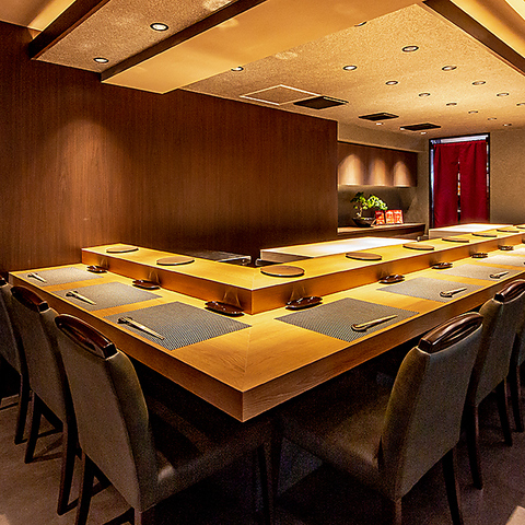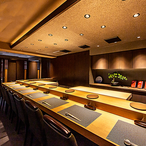 凛とした空気の満ちる店内で、潔く洗練されたカウンターと個室席。会食、接待などのオフィシャル利用、海外ゲストを招いての会にぴったりな店内です。