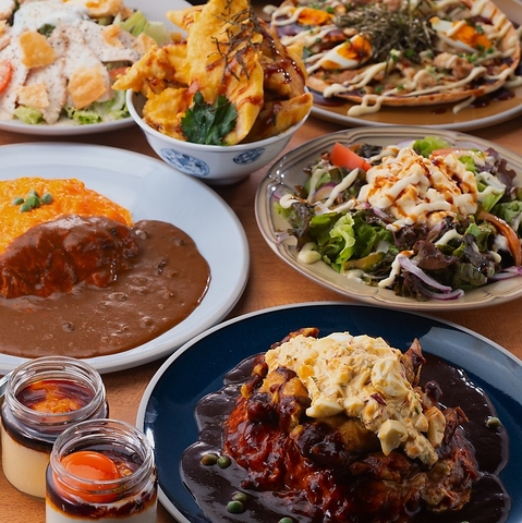 ランチ・カフェ・ディナーと幅広く楽しめる当店。チキンバーガーやオムライス、カラフルなクリームソーダなどカフェメニューも充実♪濃厚デミグラスのオムライスをはじめ、カレーやクリームソースなど多彩な味わいをご用意。お子様ランチやポテトフライなどキッズメニューも豊富に取り揃えております♪