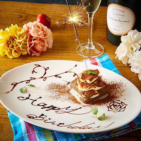 お誕生日や記念日のお祝いにぴったり♪世界にひとつだけのメッセージ入りデザートプレートでサプライズ演出!お席のみのご予約でもご注文可能ですので、ぜひお気軽にご利用ください♪※写真はイメージです