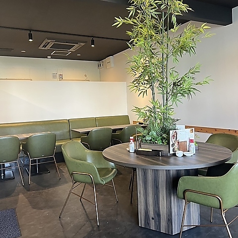 竹の緑を眺めながらくつろげる円卓席。和モダンな雰囲気でゆったりお食事を♪