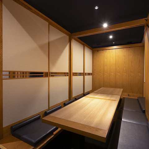 《扉付き個室》2名様~46様まで個室のお席へご案内いたします。和モダンをテーマにした個室席は,程よい暗さがオシャレな雰囲気を演出し、ビジネスシーンやデートにもご活用いただけます。少人数からでも気軽にお越しください。接待や会社宴会にオススメです。