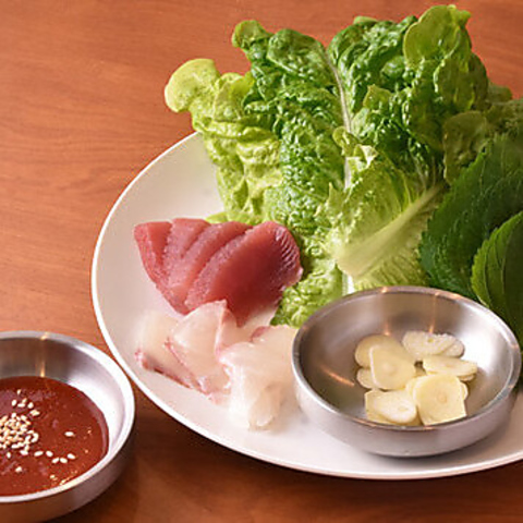 お刺身をサンチュやエゴマの葉、スライスにんにくで包んで頂く一品です。特製チョジャン(酢コチュジャン)につけてお召し上がりください。