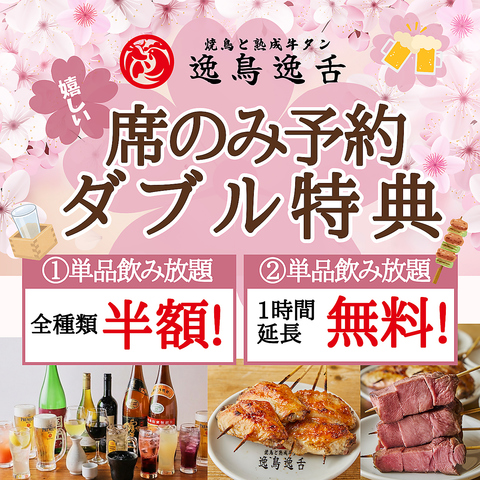 席のみ予約でWダブル特典♪[1]単品飲み放題全種類半額(Aプラン980円→500円、Sプラン1980円→1000円、Pプラン2980円→1500円 ) [2]単品飲み放題2→3時間(日~木曜限定※祝前日除く、20時以降の予約の方限定) ※詳細はクーポン欄をCHECK★