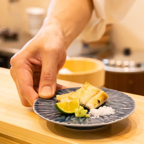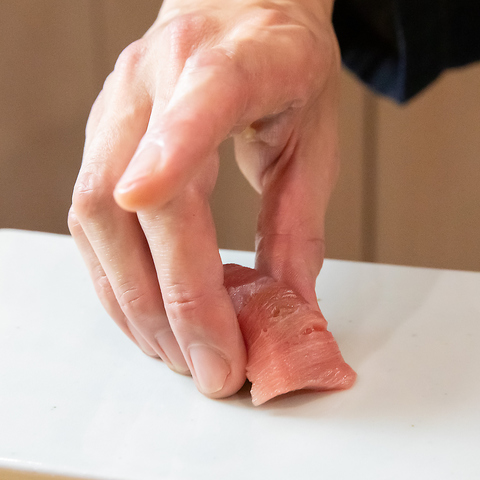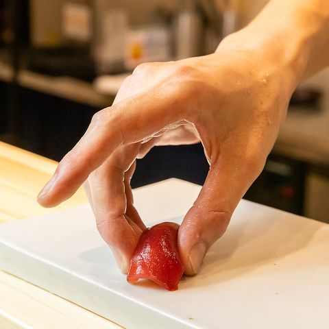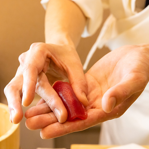 研鑽を積んだ職人の「鮨」をお楽しみください。食材の一つ一つに工夫を凝らし、厳選した目利きでの仕入れ。ご来店いただいたお客さまの喜ぶ顔を思い浮かべながら、日々、「美味しい」と「感動」を提供します。