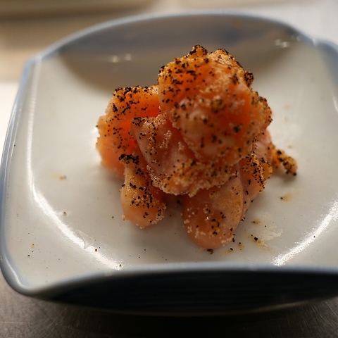 餃子だけでなく、定番の小皿おつまみー枝豆、きゅうり漬け、キムチなど気軽なものから、チャーハンやビーフン、ホルモンや日替わり一品料理まで幅広く揃っています。素材そのものの旨味とお酒との相性まで計算された一皿一皿を肩肘張らずにお愉しみください。写真は「コウネ炙り刺し」1520円(税込)