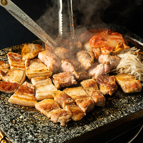 野菜の上にニンニク、キムチ、豚肉を乗せて包んで食べる焼肉!お肉は鹿児島島の霧島豚を使用し、本場の韓国人さえ惚れ込んでしまうぐらいの美味しさがあるお肉ですスタッフが丁寧に目の前で焼いて提供させていただいてます!ゆっくり韓国のサムギョプサルをお楽しみください!