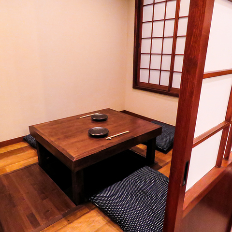 【座敷】4名様でご利用いただけるお座敷をご用意しております。木の温もりを感じる落ち着いた雰囲気。足を伸ばしてゆっくりくつろげる空間は会社帰りのお食事や、少人数での接待、会食にもおすすめです。