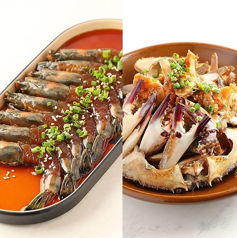 【カンジャンケジャン】新鮮な生のワタリガニを特製醤油ダレに漬け込み、旨味を引き出した絶品料理♪/【カンジャン海老】プリプリのエビを濃厚な醤油で漬け込んだ、癖になる旨さ。エビの食感と風味が絶妙にマッチし、ご飯が進む一品◎