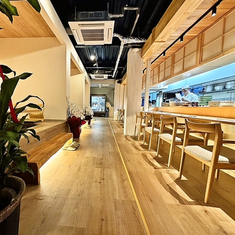 当店ののカウンターは、職人が目の前で調理される姿を見ることができます。お一人様でのご来店も多いので、お仕事帰りにもふらっと立ち寄りやすいお店です。おひとり様でも、デートでもお気軽にご利用いただけるよう、お席の間隔をあけております。