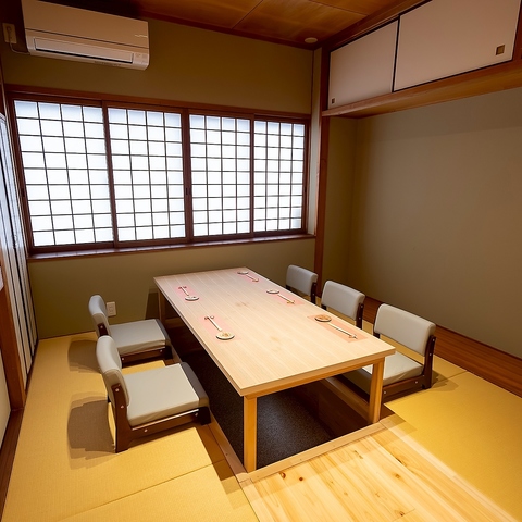 | 掘りごたつ個室 | 6名様×1 | 「茶の間」をイメージした和室の完全個室です。畳仕様の掘りごたつ席となっており、ご家族でのご利用や大事な接待など、他のお客様を気にせずプライベートを大切にしたいシーンなどで是非ご利用ください。 |
