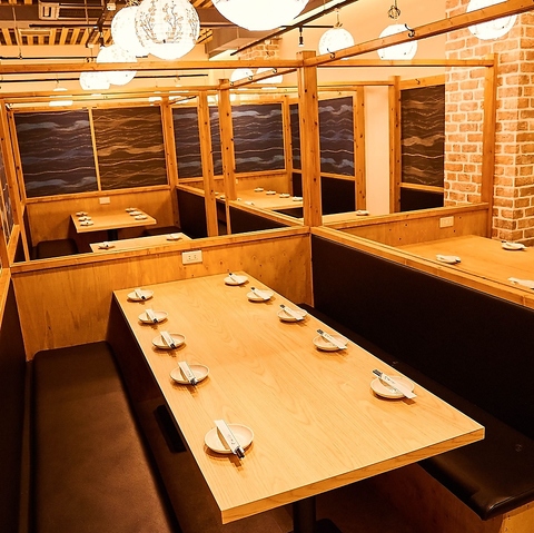 【完全個室完備】店内に入ると隠れ家のような寛ぎの空間が広がります。個室席は2名様から団体様まで幅広く対応!最大70名様までの個室もご用意可能です。お仕事帰りの飲み会、接待や二次会、各種ご宴会をお楽しみください。飲み放題付コースは多様な価格帯でご用意しております◎ただいま飲み会・宴会のご予約受付中!