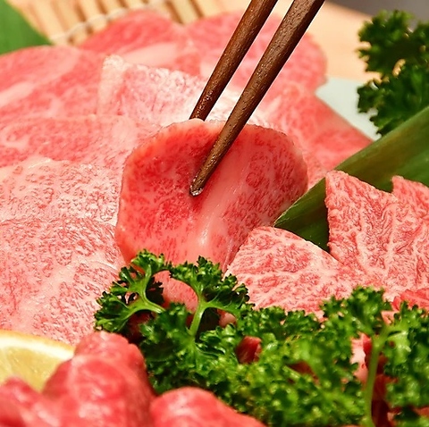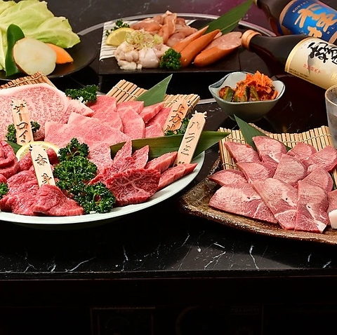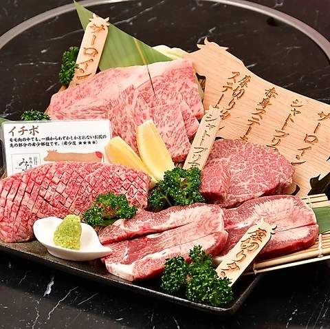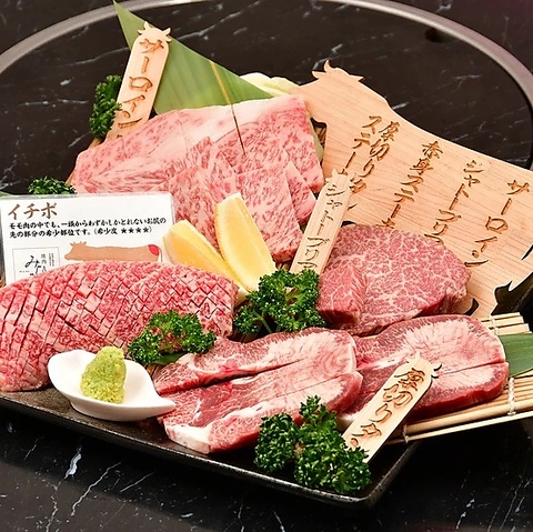 丸ごと一頭仕入れる新鮮で高品質な宮崎牛は、どの部位も自信をもって提供いたします。その中でもおすすめの部位を盛り合わせにしてセットメニューに。特製タレ又は岩塩で。うれしい2時間飲み放題付き☆