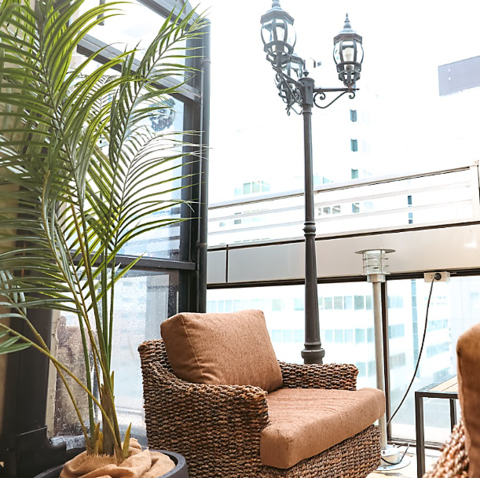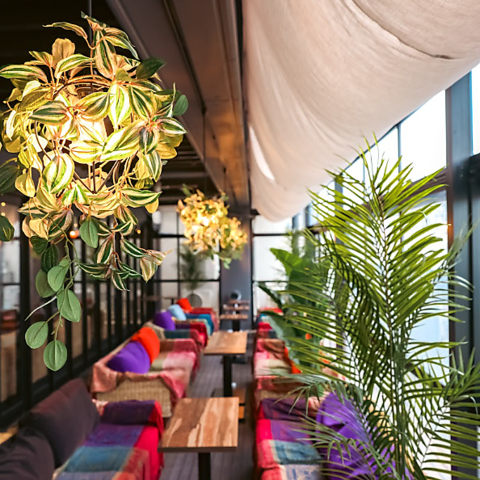 【テラス席】緑と自然光に包まれた、まるで南国リゾートのような開放的テラス席。心地よい風を感じながら、ラタン調のソファで極上のリラックスタイムを過ごせます。昼は爽やかに、夜はムーディーに。都会の喧騒を離れ、友人や恋人とゆったり語り合える特等席へご案内します。