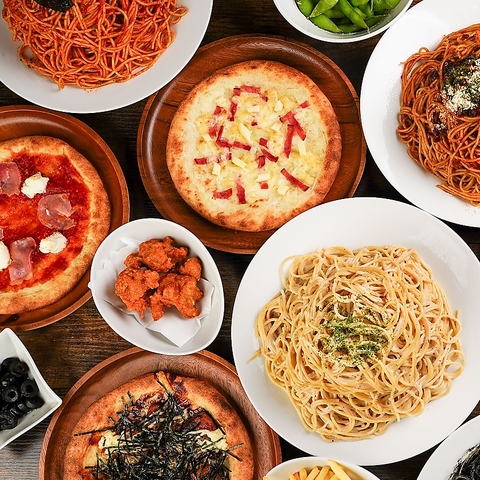 友人や恋人と!全12種のピザやメガ盛りパスタ、定番おつまみも充実。持ち込みもOKで自由な時間を満喫♪
