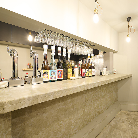 コンクリート基調のスタイリッシュなカウンターは無機質でおしゃれな雰囲気が女性に人気♪落ち着いていながら気軽に使える空間で、仕事帰りのサク飲みや友達とのちょい飲みにぴったりです。立ち飲みでもリラックスして過ごせる居心地の良さがあり、初めての方でも入りやすい雰囲気。自然と長居したくなる心地よさです。