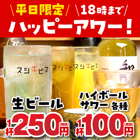 平日限定ハッピーアワー!18時まで生ビール250円、サワー、ハイボール各種が1杯100円!(税別)