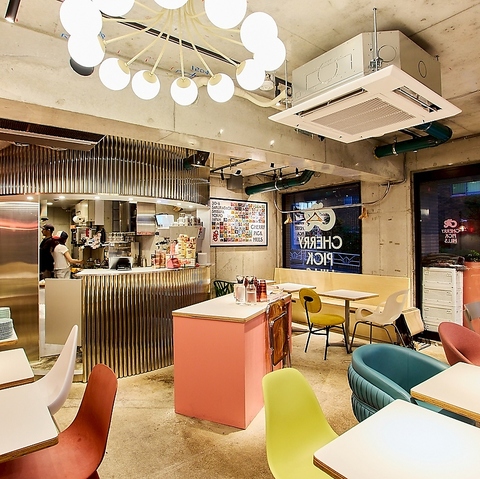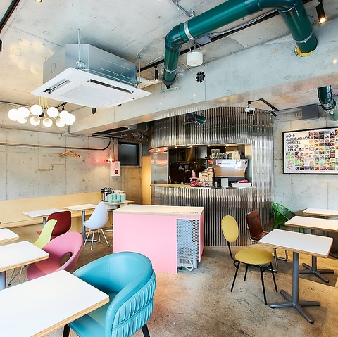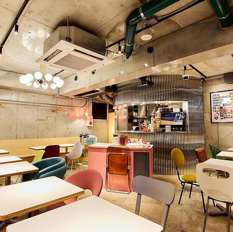 カラフルで可愛いソファと、ガレージ感のある内壁が独特な雰囲気の店内◎1名様から20名様規模までご利用いただけるテーブル席をご用意しております♪ご友人とのランチから中規模なお集まりまで、様々なシーンに合わせてご利用ください。