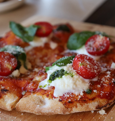 トマトソース、ストラッチャテッラ、ミニトマト、バジル、モッツァレラチーズ