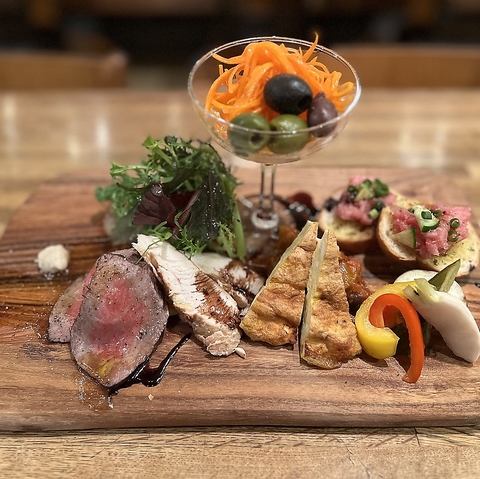 自家製の和牛もも肉を使ったローストビーフや鎌倉野菜を彩りよく盛り付けた前菜です。