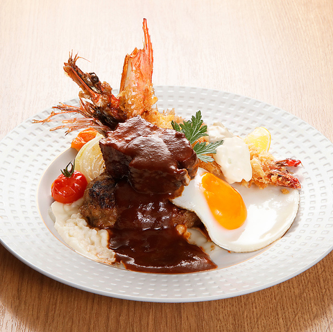 ハンバーグに、有頭エビフライと豚バラ肉ワイン煮がトッピングされたお得なメニュー。自分へのご褒美ランチとして、是非ご賞味ください。