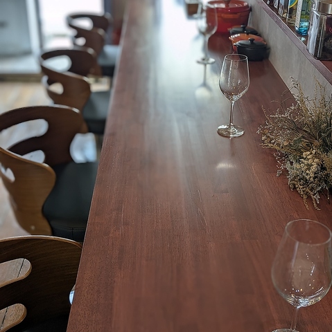 カウンターは4席あります。奥行き60センチありますのでゆったりくつろいで食事する事が出来ます。お一人様でもお気軽にどうぞ。