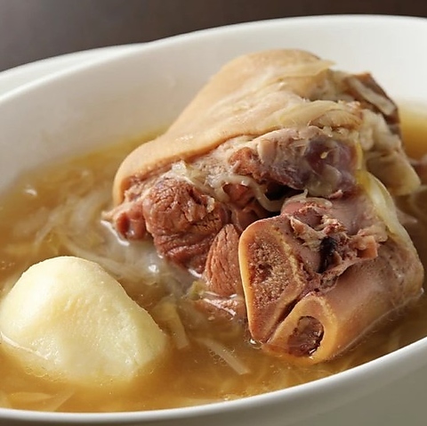 コラーゲン豊富な豚すね肉を白ワインベースのあっさりスープで煮込みました。